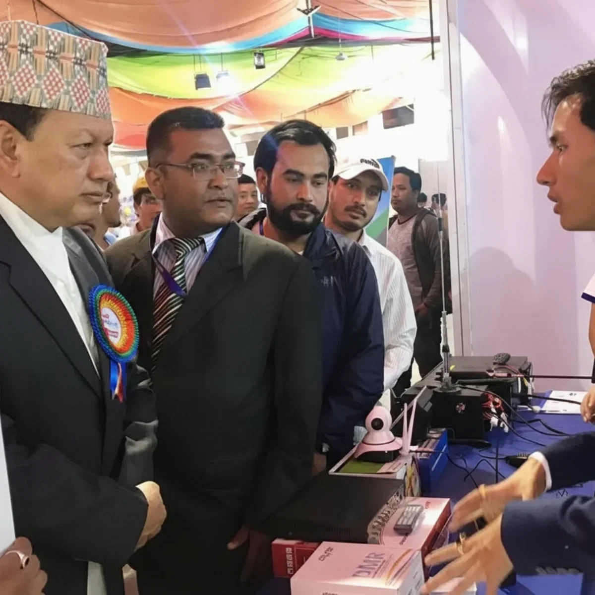 “Hon. Mohan Bahadur Basnet, Communication Minister, visited Ipak International Pvt. Ltd.’s stall at CAN Info-Tech 2017, exploring their latest security and communication solutions, including Walkie Talkies, DMR Radios, and PoC Radios.”
